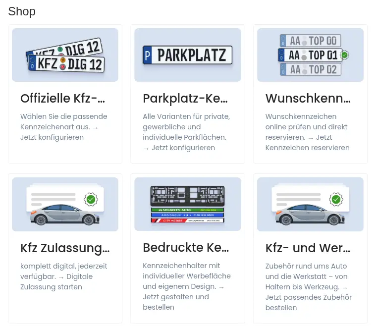 Wir bieten Saisonkennzeichen, H-Kennzeichen für Oldtimer, rote Händlerkennzeichen, grüne Kennzeichen für steuerbefreite Fahrzeuge, E-Kennzeichen für Elektrofahrzeuge sowie Kennzeichen für Motorräder, Quads, Leichtkrafträder und Anhänger. Auch Kennzeichen in Carbon-Optik und aus Kunststoff sind verfügbar.